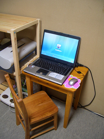 部屋自体のレイアウトは、間取りや、家そのものの狭さの都合上、基本的にほとんど・・・・いえ、全く変えることはできなくて残念ですがl、棚を買ったり、ネットで色々探してレトロっぽい、小学校低学年や幼稚園の子達が座るようなサイズのチャイルドデスクとチャイルドチェアをPC用として買いました。